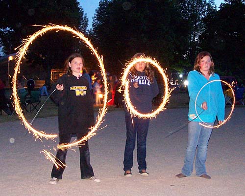 Erin (left) and her friend play with the sparklers as dusk falls and