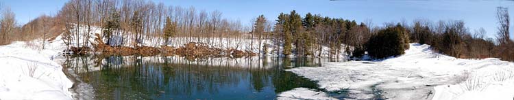 Further to the south we hit one of my favourite areas - Frog Pond (H), as named on a large rock which sits beside the waters. An old beaver house sits unused on the south edge. Besides the main trail (large red line) there are many side trails that criss cross the area, one circles Frog Pond and you can cross to the east trail. Walking past Frog Pond, which empties into the Black Creek, you pass through an elevated portion of the path adjacent to a small pond (I) and beside the Black Creek Valley as the underground sewer also continues it's journey south. The bend in the trail which brings you along the fence of the sewage treatment plant (K) faces a steep hill (J) where some snowboarders were practicing their cuts and turns.